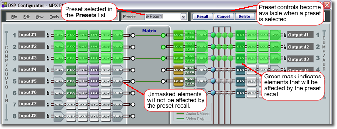 Preset Preview/RecallSee topics, Preset Save, and Preset Overview, for more information. A preset can be previewed in either Live or Emulate mode by selecting the preset from the Presets drop-down list in the menu bar. In Live mode, the DSP Configurator program is reading the preset marks from the device. In Emulate mode, the program is accessing presets contained in the current configuration file. In this preview state, changes cannot be made to any element within the DSP Configurator. In Live mode, real-time changes to the Current State will not be reflected in the DSP Configurator while in this preview state. After a preset is selected from the Presets drop-down list, the program indicates to the user that a preset configuration is being previewed by displaying the preset elements that will be affected by a preset recall with a translucent mask over the element. Elements without a translucent mask represent elements in the Current State (Live mode) or Current Emulation (Emulate mode) that will be unaffected by a preset recall. To preview and recall a preset: 1. Select a preset from the Presets list. Elements contained in the preset are indicated by a translucent mask. 2. To preview only (and not recall), click Cancel. 3. Click Recall to apply the preset to the Current State of the device, at which point the preset reverts to "Current State." In Emulate mode, the preset reverts to "Current Emulation."