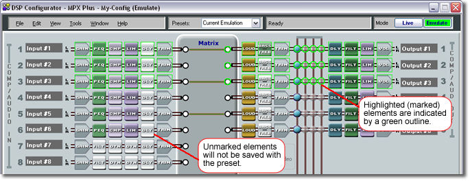 Preset SaveA preset may be saved in either Emulate mode or Live mode. Saving a preset in Emulate mode will store that preset in the file that is currently open. That file must then be saved to disk (recommended), and/or pushed to the device after a connection is established. In Live mode, the preset is saved directly to the device. See topics, Preset Preview/Recall, and Preset Overview, for more information. First, create a configuration from which you would like to save a preset(s). In Emulate mode, you are working from the Current Emulation. In Live mode, this is the Current State of the device. To build a preset, you must first mark (highlight) elements to be saved. Highlight the elements in the DSP Configurator to be saved as a preset using the following methods: • Click an element to highlight, then Ctrl + click additional elements. • Click an element to highlight, then Shift + click another element in that row (or column) to select the row (or column). • Click and drag over an area to select the area. You may then Ctrl + click additional elements. • Go to Tools | Presets and select Mark All Items. This will mark all elements within the DSP Configurator, which will save a "full" preset. To save a preset: 1. Highlight the elements to be saved in the preset. 2. Go to Tools | Presets and select Save Preset. 3. A dialog appears informing you that only highlighted elements will be saved in the preset. Click OK. 4. Select a Preset Number in the Save a Preset dialog. The number of the first available preset location appears in this list. Scroll to select a number other than the one displayed, if desired. 5. Type a Preset Name. The Preset Name field displays "unassigned" when the preset location is empty (available). If a preset is not named in the save process, a default name will be assigned (e.g., Preset 01). 6. Click OK. If this procedure is performed in Live mode, the preset is saved directly to the device. In Emulate mode, the preset becomes part of the file that is currently open. In either case, the preset does not become part of the file until it is saved with the file.