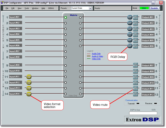 Video SettingsVideo settings can be made from the Video I/O view, which can be accessed by going to View | Video I/O, pressing F4, or clicking on the Video I/O hyperlink in the Legend section of any workspace. For more information on Video I/O and other workspaces, see DSP Configurator Workflow. RGB Delay - During switching, individual computer video outputs can be set to switch the input sync source first, and then the RGB portion of the signal. This brief delay allows the display to adjust to the new sync signal before sending the picture, providing a glitch-free switch. RGB Delay may be set from 0 to 5 seconds in 0.5 second increments. To set RGB Delay: