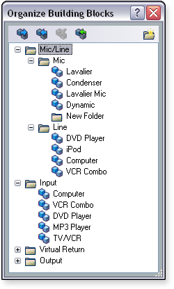 The Organize Building Blocks option lets you organize listed building blocks. You can also import and export the building blocks file so that you can use your set of building blocks on other computers. See the Building Blocks section for more information about using building blocks in signal paths and modifying building block configurations. |